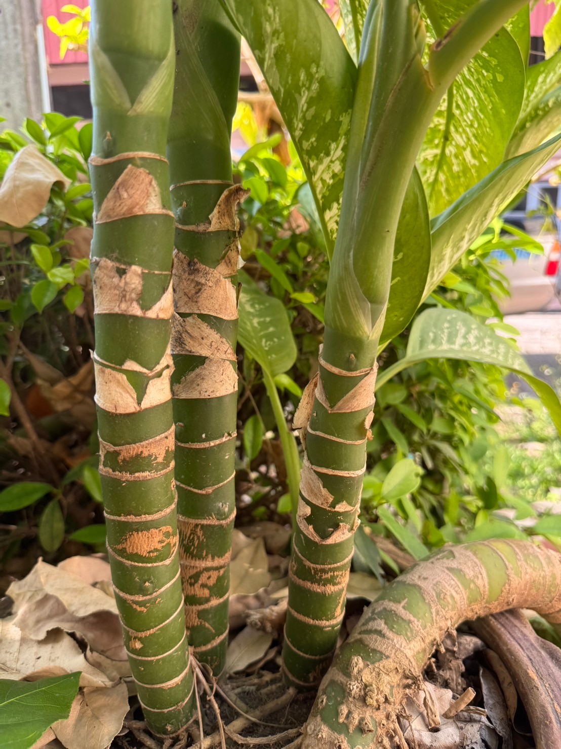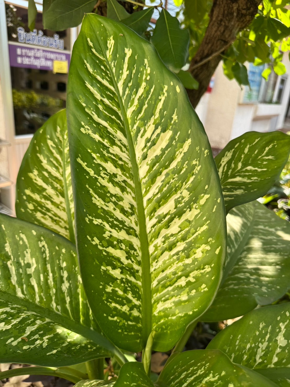 ลักษณะเด่น: ใบใหญ่ เรียงสลับ กลางใบมีสีขาวกระจาย ก้านใบอวบ มีกาบ